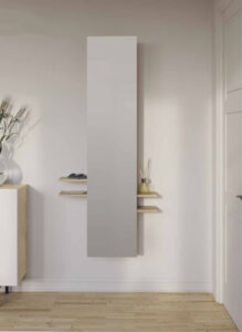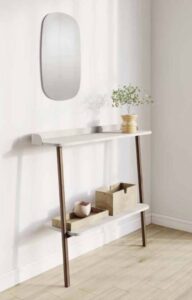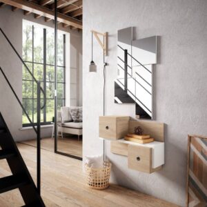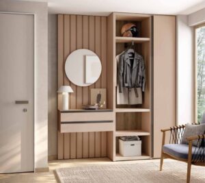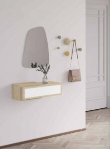 Es un espacio que podemos aprovechar de almacenaje poniendo muebles de poco fondo, ya que las entradas no suelen ser muy grandes ni luminosas por lo general y lo que no podemos hacer es recargarlas más. Incluso, si la entrada es muy justita podemos poner algo mucho más sencillo como una balda o una consola sin almacenaje para que se vea más ligera, y lo que no suele faltar en la entrada de una casa es un espejo, que además de servirnos para mirarnos justo antes de salir de casa también tiene la función de hacer ese espacio más amplio, ya que reflejará la luz.