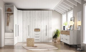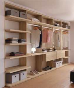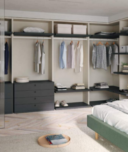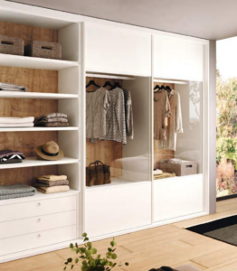 Tenemos la opción de un vestidor que sea »tipo armario» es decir utilizamos los mismos módulos (casi) para configurar el vestidor, pudiendo elegir que sea con o sin puertas.
